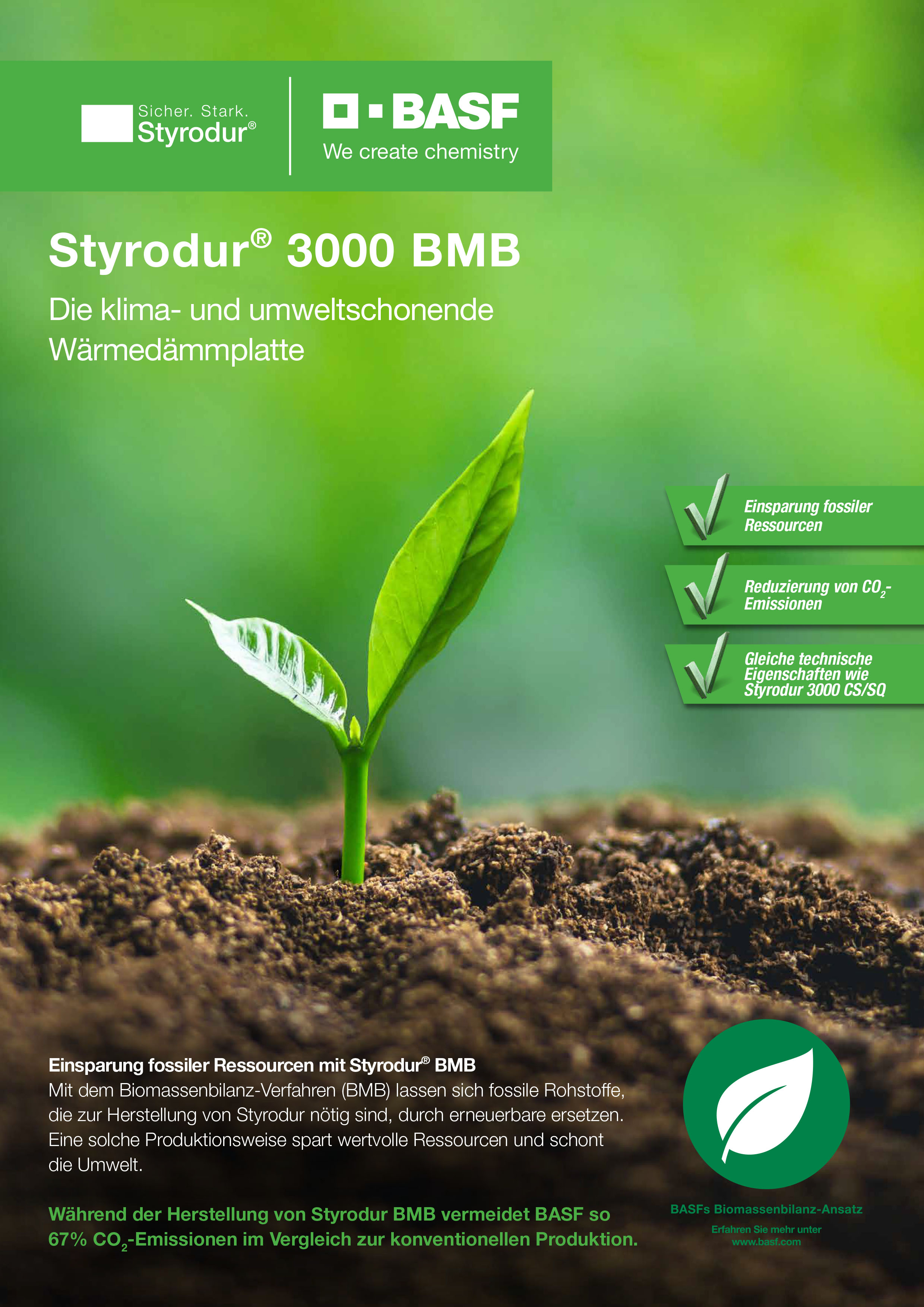 Bei der Herstellung von Styrodur BMB vermeidet BASF so 67% CO2-Emissionen im Vergleich zur konventionellen Produktion und trägt zu einer weiteren Einsparung von Ressourcen bei.